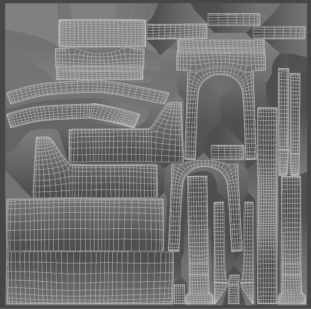 I unwrapped the various models first, then I polished them up a bit so the extra bevels and other upresing elements would transfer over to the UVs automatically. Even so, the transfer wasn't entirely perfect, and I had to go back to the UV Editor, and rescale some of the meshes to get a decent layout.